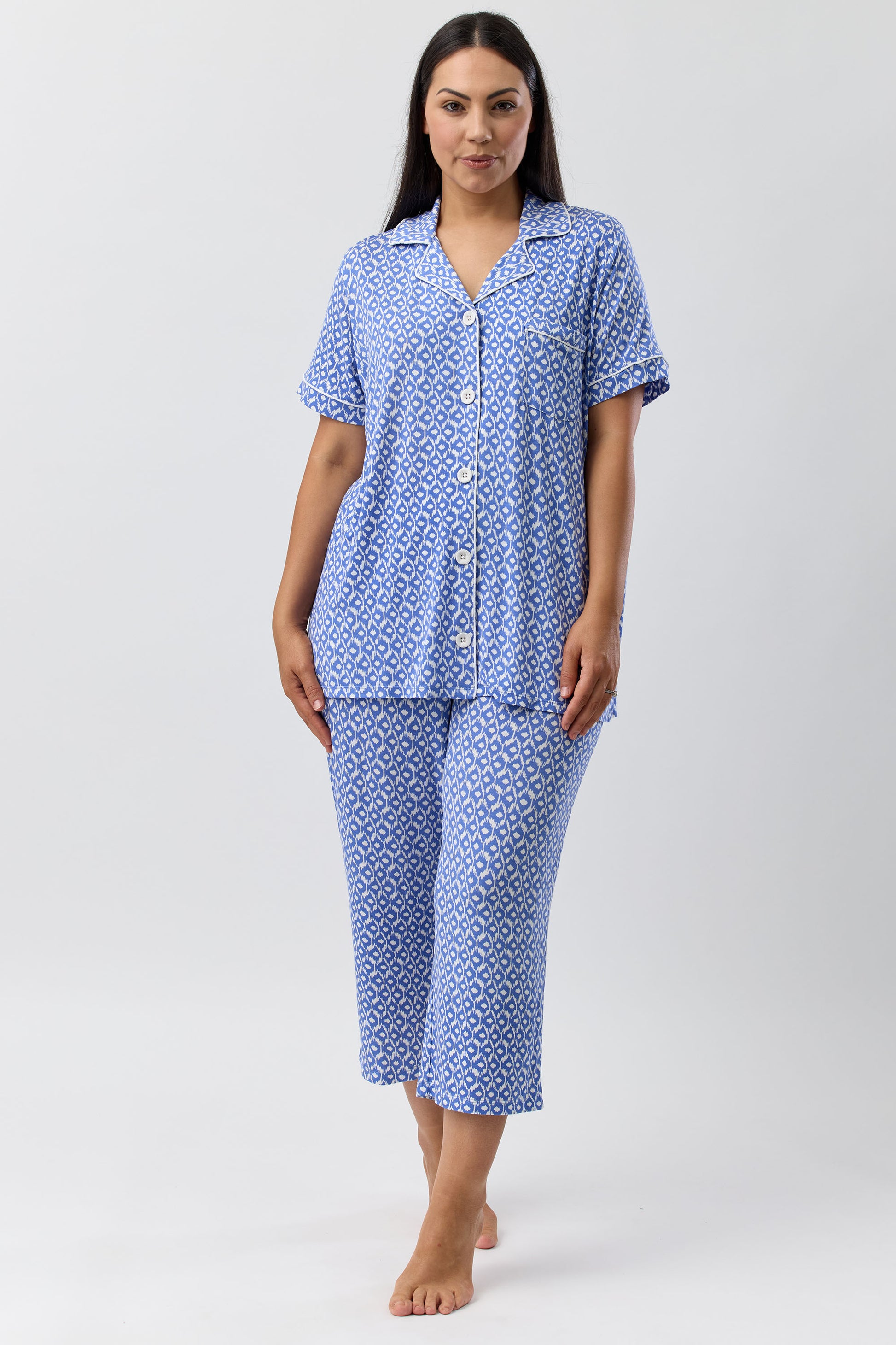 Elevate your night time wardrobe with the Aztec Revere PJ. Crafted from silky soft viscose jersey, this pyjama set offers exceptional comfort while showcasing a refined Aztec print. The breathable fabric drapes beautifully for a relaxed yet elegant fit, perfect for restful evenings with a touch of sophistication.