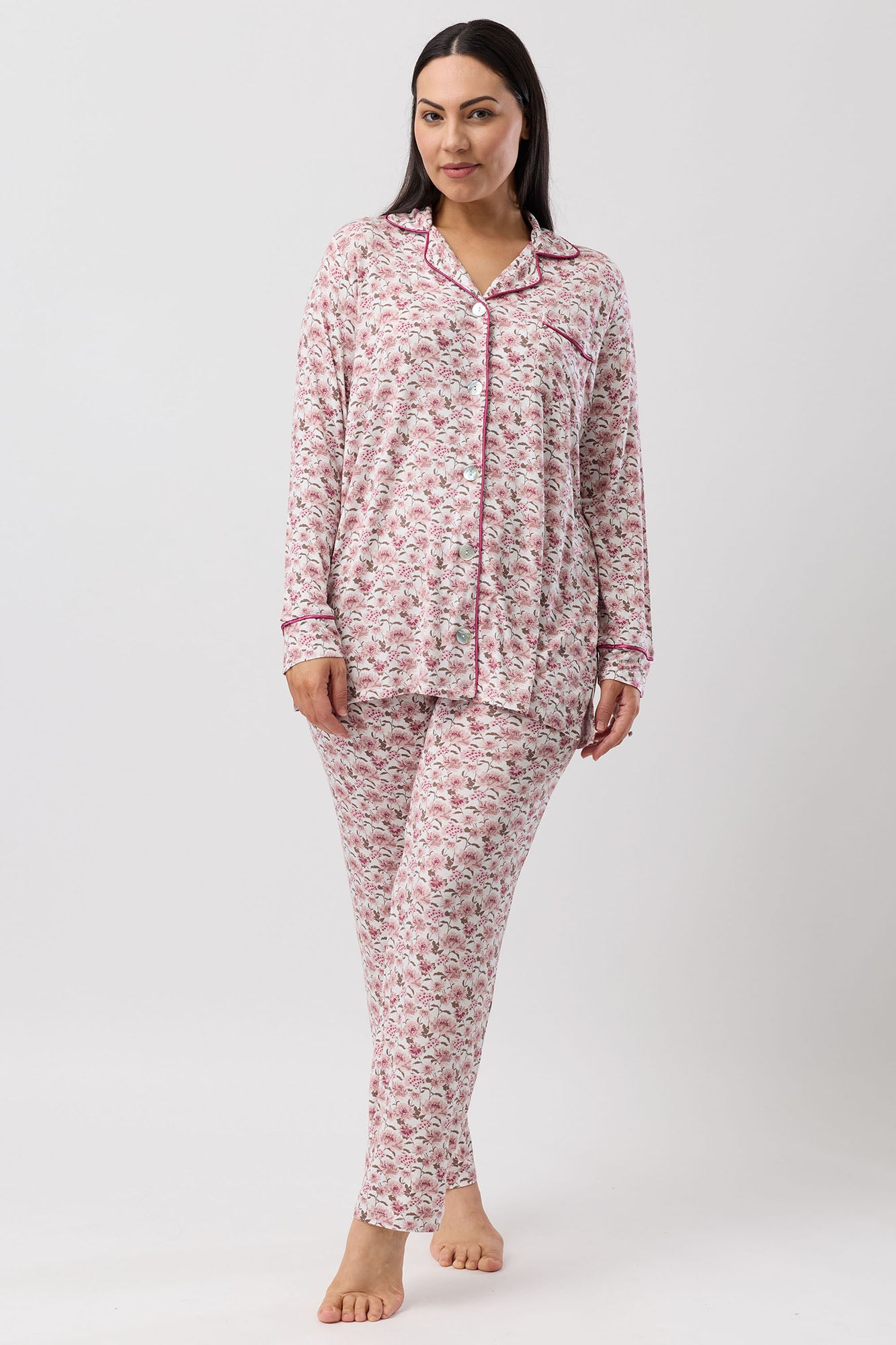 Embrace effortless elegance with this luxurious pyjama set, tailored from silky soft viscose jersey knit that feels wonderfully indulgent. The captivating abstract floral print brings artistic flair to your sleepwear collection, while the classic revere collar design offers timeless sophistication. Designed for those who appreciate quality fabrics and refined style in their everyday loungewear.