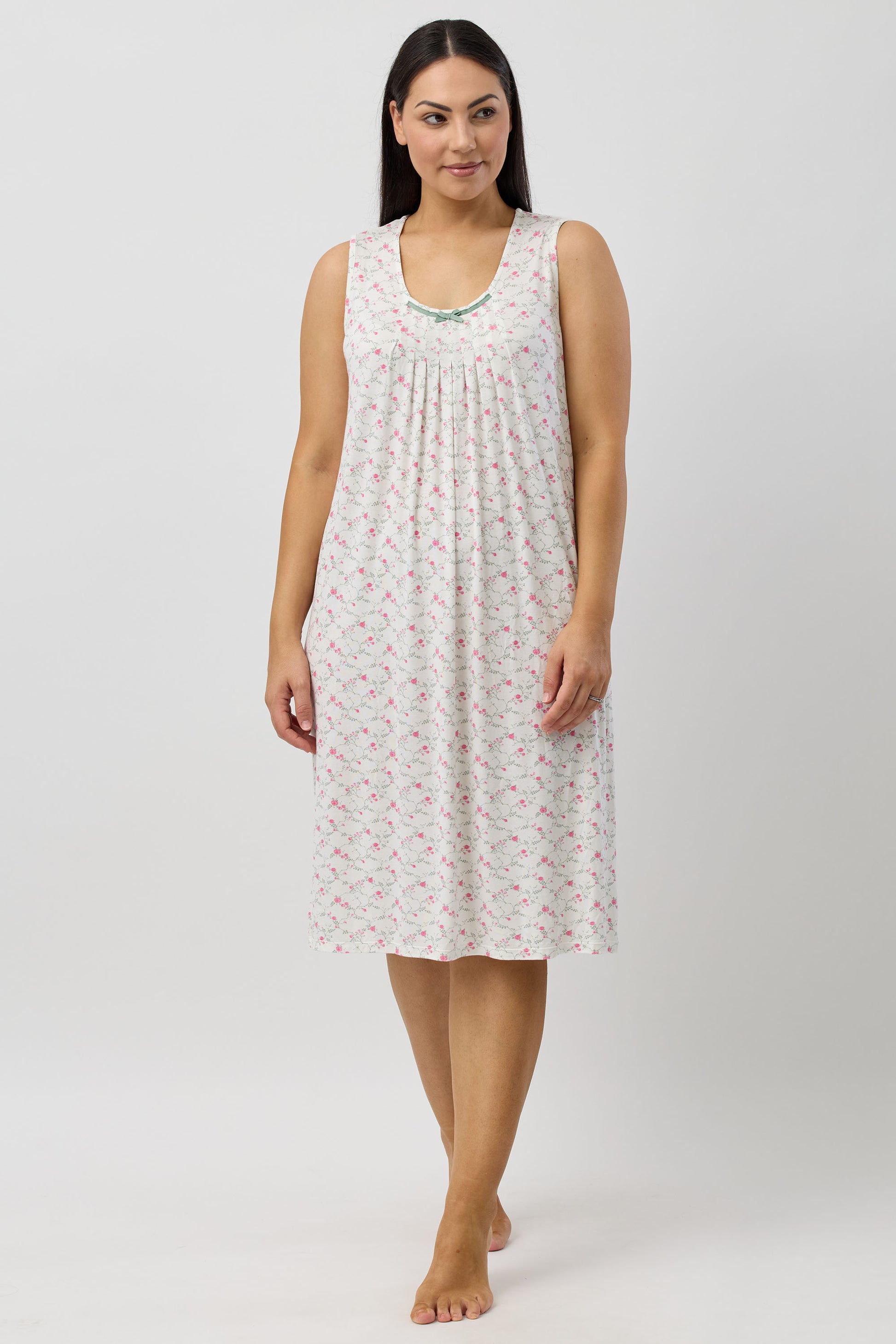 The Tea Rose Sleeveless Nightie Rose offers a delicate blend of elegance and comfort. Made from silky, soft viscose jersey, this sleeveless nightie features a graceful rose print, complemented by grosgrain ribbon trim and soft pleating for a refined, feminine silhouette perfect for tranquil evenings.